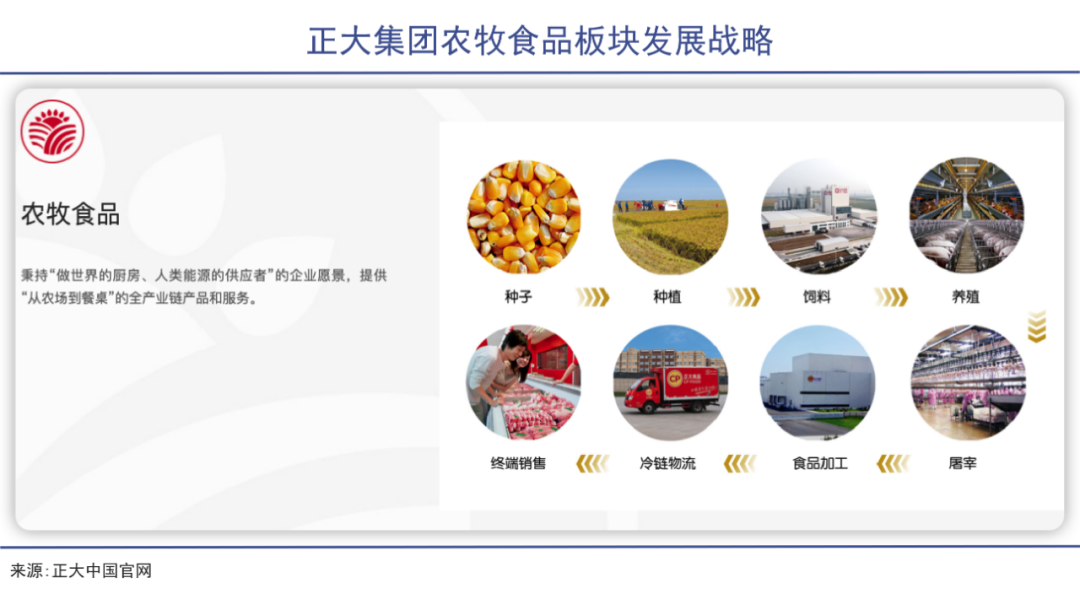 从一家菜籽店起步,正大集团历经四代,已经发展成以农牧食品、批发零售、电信电视三大事业为核心,同时涉足金融、地产、制药、机械加工等10多个行业和领域的多元化企业集团。2021年全球销售额高达840亿美元。